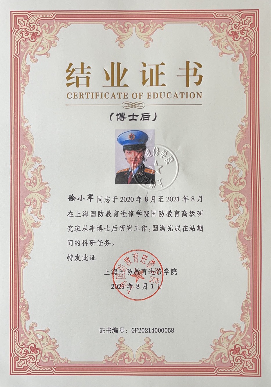 毕业论文合格者发上海国防教育进修学院“国防教育高级研究班(博士后)结业证书”。