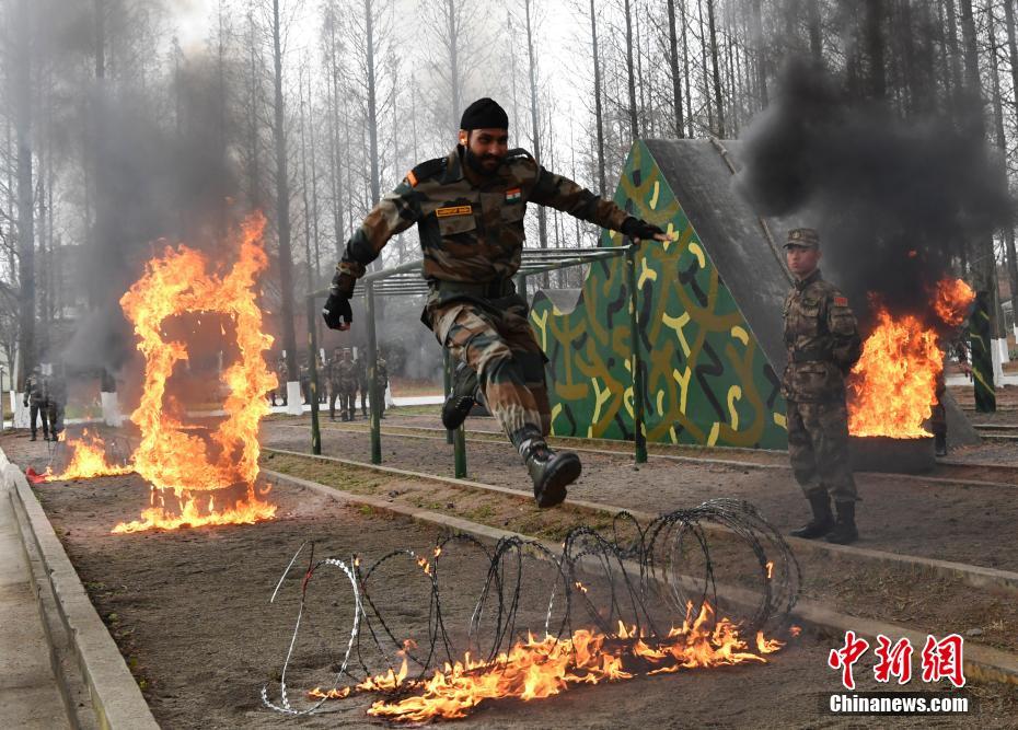 12月22日,参加“携手-2018”中印陆军反恐联合训练的官兵在成都举行“城镇条件下街区联合反恐作战”实兵演练。双方官兵在实战化背景下联合进行城市障碍、牵引横越、楼宇攀登和滑降、战斗射击、特种驾驶、楼房突入解救“人质”等6个课目的演练。图为通过火障。 中新社记者 安源 摄