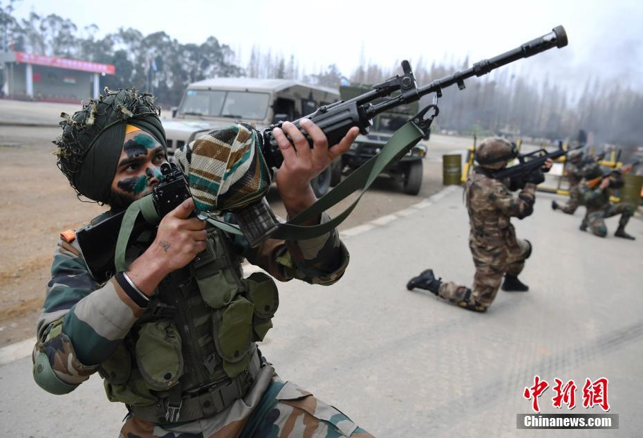 12月22日,参加“携手-2018”中印陆军反恐联合训练的官兵在成都举行“城镇条件下街区联合反恐作战”实兵演练。双方官兵在实战化背景下联合进行城市障碍、牵引横越、楼宇攀登和滑降、战斗射击、特种驾驶、楼房突入解救“人质”等6个课目的演练。图为封控组对目标区域进行封锁。 中新社记者 安源 摄