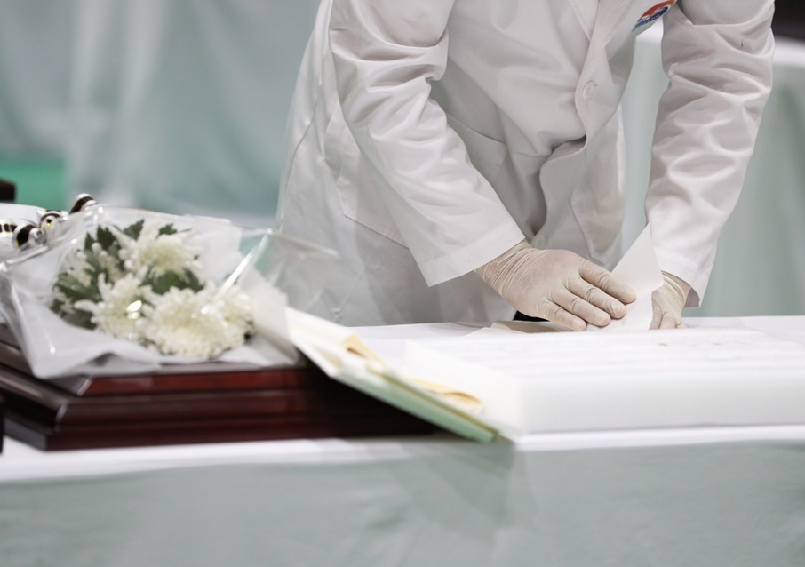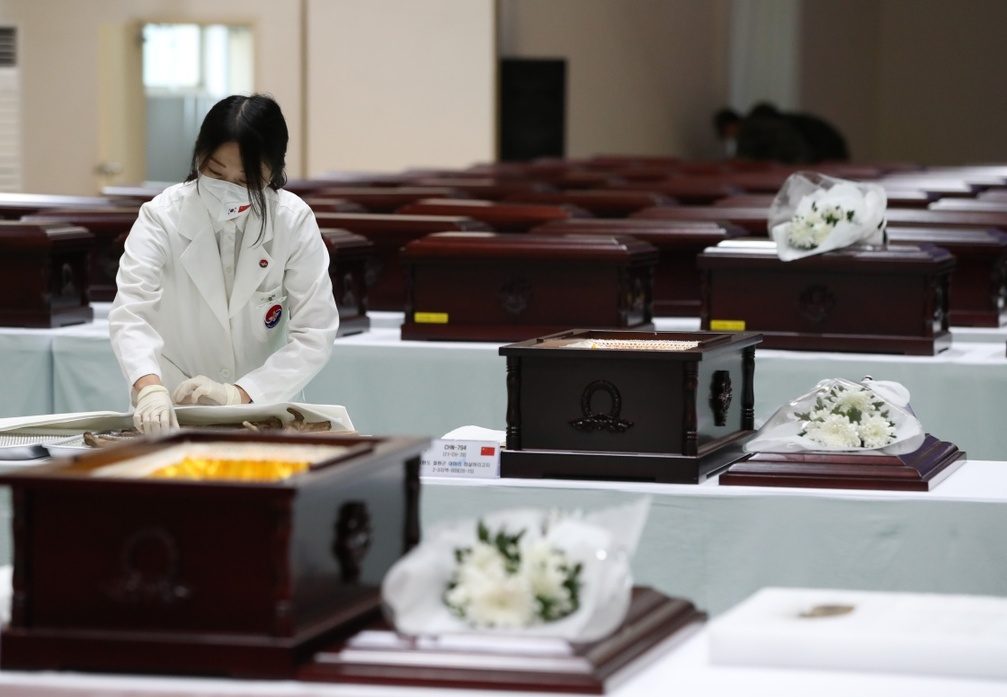 9月1日,在韩国仁川,韩方工作人员将志愿军烈士遗骸入殓。新华社记者 王婧嫱 摄