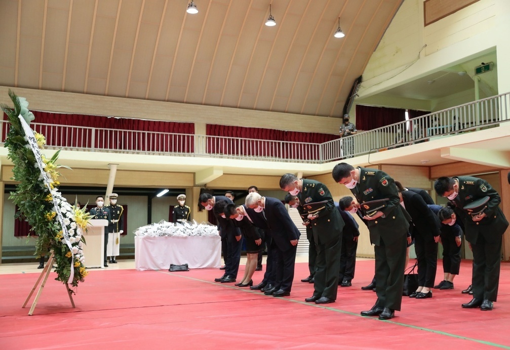 9月1日,在韩国仁川,中方代表团成员在志愿军烈士遗骸装殓仪式现场鞠躬致敬。新华社记者 王婧嫱 摄