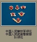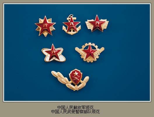 1965年6月,取消军衔制,全军统一佩带全红领章。1985年5月,陆军、海军、空军领章又分别改为红色、黑色和天蓝色,军官领章三面镶金黄色边,中间缀五角星徽;士兵领章缀军种符号。1988年10月,中国人民解放军实行新的军衔制,全军官兵改佩军种(专业技术)符号或领花,军人常服和制式衬衣缀军种或专业技术符号(见军兵种专业勤务符号),军官礼服缀领花。1992年5月,文职干部统一配发服装,佩带文职干部领花。中国人民武装警察部队自1989年2月起,亦改佩领花,样式为圆形,由盾牌和松枝叶组成,金属材料制作。