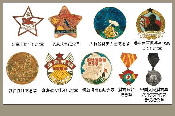 革命战争时期,由于处于战争环境,中国人民解放军颁发和制作纪念章没有统一的规定。 土地革命战争时期,曾经颁发过“东江暴动纪念章”、“闽浙赣边区坚持斗争纪念章”、“红军十周年纪念章”等。抗日战争时期,冀鲁豫八路军部队颁发过“抗战八年纪念章”,延安和辽东军区八路军部队颁发过“抗战胜利纪念章”等。解放战争时期,许多军区和野战军为纪念作战区域和战役的胜利,都曾颁发过纪念章。如1948年第四野战军暨东北军区颁发的“解放东北纪念章”,1949年华东军区颁发的“淮海战役胜利纪念章”、“渡江胜利纪念章”。中华人民共和国建立后,各军区先后都颁发过纪念章。如1949年11月西南军区颁发的“解放西南胜利纪念章”,1950年中南军政委员会颁发的“解放华中南纪念章”,华北军政委员会颁发的“华北解放纪念章”,西北军政委员会颁发的“解放西北纪念章”,中南军区兼第四野战军颁发的“解放海南岛纪念章”。同年9月,为纪念中央人民政府召开全国战斗英雄代表会议,颁发了“中国人民解放军战斗英雄代表会议纪念章”。1952年8月,西南军区颁发了“解放西藏纪念章”。同年,中央人民政府人民革命军事委员会颁布《中国人民解放军立功与奖励工作条例(草案)》,规定全军统一制发“英雄纪念章”、“模范纪念章”。1954年2月,全国人民慰问人民解放军代表团,向全军官兵颁发了慰问纪念章。1979年,为表彰自卫还击作战部队的功绩,总政治部颁发了“自卫还击保卫边疆”纪念章。1986年,成都军区和昆明军区向云南边防部队颁发了“老山、者阴山自卫还击作战胜利纪念章”。1989年7月,中央军委为表彰在首都部分地区执行戒严任务的部队,颁发了“首都卫士”纪念章。