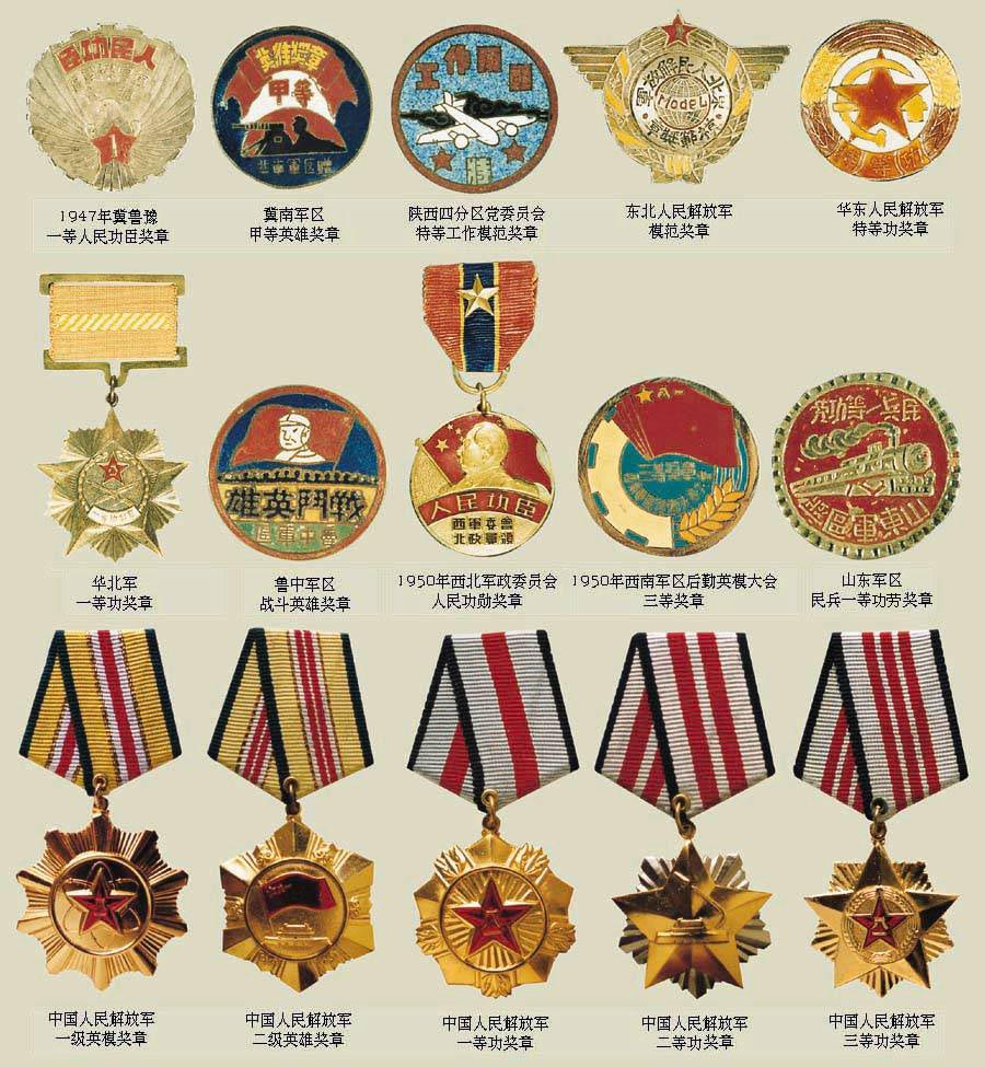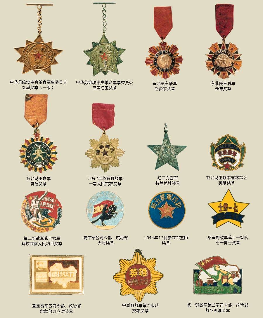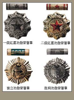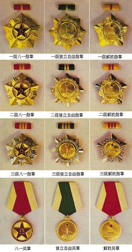中华人民共和国勋章奖章 中华人民共和国授予中国人民解放军在中国人民革命战争时期有功人员的荣誉证章。包括:八一勋章和八一奖章;独立自由勋章和独立自由奖章;解放勋章和解放奖章。 八一勋章和八一奖章的中心图案是红星和八一,突出反映中国共产党于1927年8月1日独立领导革命武装的光辉史实;独立自由勋章和独立自由奖章的中心图案是红星和延安宝塔山,象征在中国共产党的领导下,革命圣地延安是中国人民抗日民族战争的革命大本营;解放勋章和解放奖章的中心图案是红星和天安门,象征中国共产党领导人民武装夺取全国胜利。