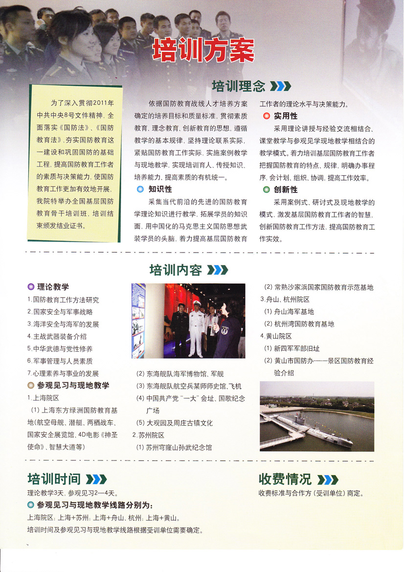 采集当代前沿的先进的国防教育学理论知识进行教学,拓展学员的知识面,用中国化的马克思主义国防思想武装学员的头脑,着力提高基层国防教育工作者的理论水平与决策能力。