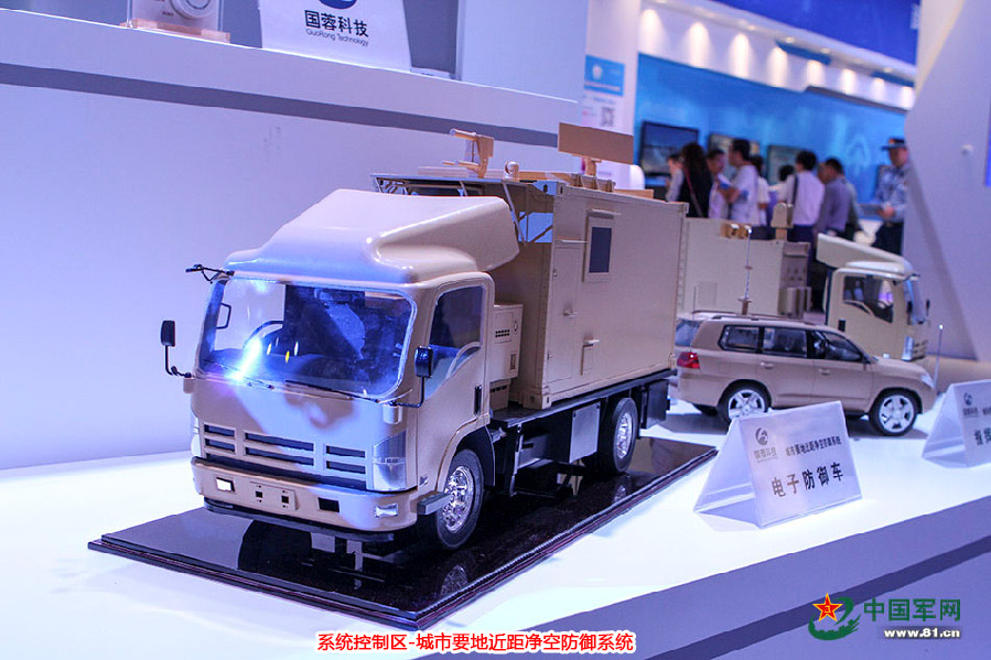 针对近两年“黑飞”无人机频发的安全隐患,此次参展的国蓉科技有限公司带来了城市要地近距净空防御系统,该系统由指控、搜索、跟瞄、干扰、毁伤、通信、供配电和载车8个分系统组成,可对防区内的无人机、航模、空飘气球、孔明灯、风筝等飞行物进行侦察预警、精密跟踪、电子干扰和激光打击,主要应用于党政办公地点、机场、重要会议、大型集会等重点场所的保护。