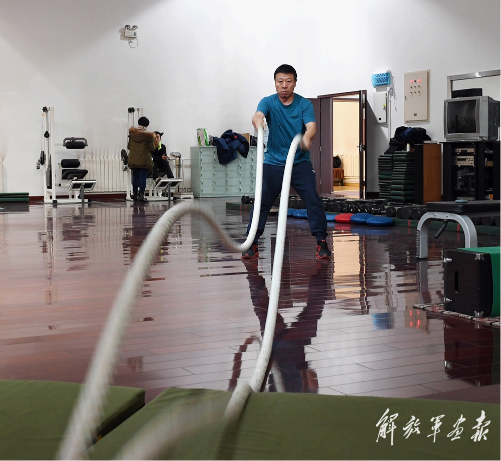 航天员刘旺在进行体能训练。