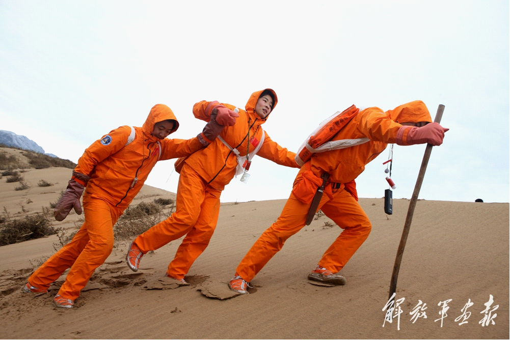 2010年10月20日,航天员在沙漠进行沙漠生存训练,中间为刘洋。朱九通 摄