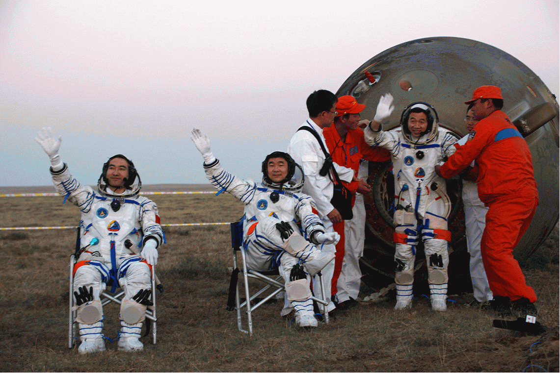 2008年9月28日,神舟七号返回地球,航天员翟志刚、刘伯明、景海鹏(从左至右)自主出舱后向现场搜救人员挥手致意。新华社记者 王建民 摄