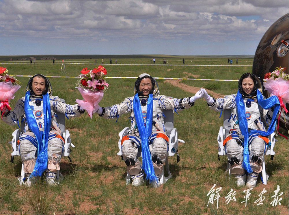 2013年6月26日,神舟十号航天员聂海胜、张晓光、王亚平出舱后手持鲜花向人们致意。秦宪安 摄
