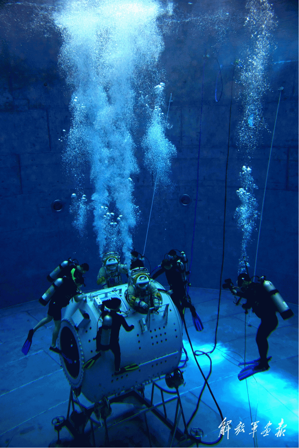 2008年3月24日,神舟七号航天员乘组正在中性水槽模拟失重训练。秦宪安 摄