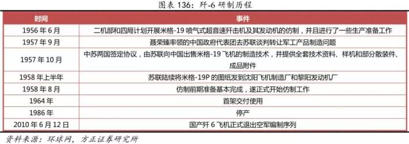 歼-6,仿制自前苏联的MIG-19,北约代号同为"Farmer"(农夫)。歼-6战机为中国自主生产第一代超音速战机,1964年首架交付使用,1986年停产,2010年6月12日,国产歼6飞机正式退出空军编制序列。歼-6是中国人民解放军空军于1960至1970年代的主力,也是中国航空工业生产装备数量最多的机型,自用生产了逾4500架,远超过该型飞机于苏联的数量,该机同时出口到了许多国家。