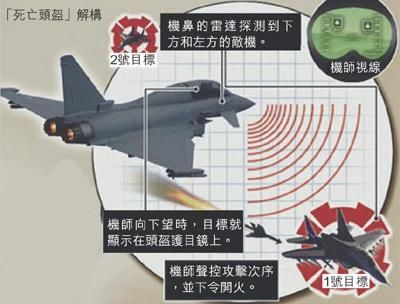 这种名为“打击者”的综合显示头盔每个价值25万英镑。头盔里面微小的光学感应器收集到的信息会被传到驾驶舱里的感应器做进一步分析,这样,飞行员所要做的只是用目光锁定头盔护目镜上的敌机,然后通过语音命令向其发射导弹。不管敌机是在下方、上方或是两侧,只要出现在飞行员的视线内,就能“收到”一枚导弹。