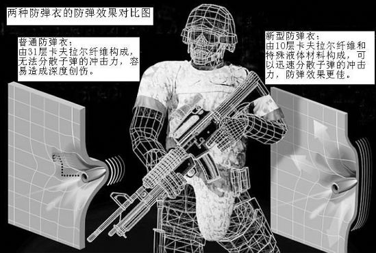 研究者还进行了对比性防弹试验,他们用一把9毫米口径的手枪首先射击一块由31层卡夫拉尔纤维组成的材料,再用同一把手枪射击一块由10层卡夫拉尔纤维和上述液体构成的材料。结果显示,当子弹撞击到“液体防弹衣”时它的冲击力马上被分散,破坏力大大降低。很多士兵之所以殒命战场或身受重伤就是因为他们穿的防弹衣没有这种功能,当子弹的冲击力集中在一个点或者一个很小的区域时,其穿透力是很强的。