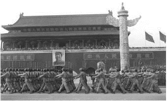 1950年10月1日,首都各界40余万人在北京天安门广场举行庆祝中华人民共和国成立一周年大会。上午11点,中央人民政府秘书长林伯渠宣布庆祝大会开始,在国歌声中,礼炮齐鸣28响。阅兵式开始。受阅部队以空军和海军学校的学生为前导,依次为步兵、炮兵、战车摩托化部队和骑兵。当步兵行进时,空军飞机在会场上空由东向西飞行受阅。