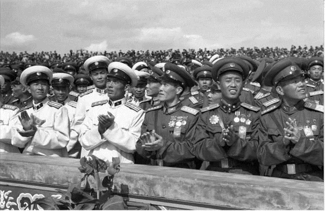 1955年国庆阅兵式,穿新式军服的三军代表在天安门观礼台上。图源:中国军网