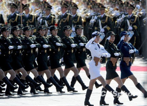 国庆阅兵在北京举行,由陆军、海军、空军、二炮、武警和后备力量6大阵容组成,全面展示共和国武装力量的14个徒步方队依次通过天安门城楼接受检阅。图为三军女兵方队。