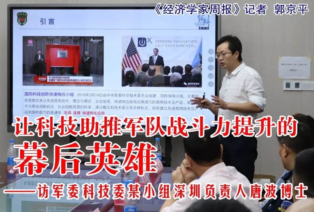 临近采访结束,我不禁还是问一句常规的话题,让他谈谈参与某小组工作的体会。唐波说:“能够在改革开放前沿深圳特区为国家战略落地服务,使命光荣,责任重大。小组工作高大上的叫法是‘星探'和‘前哨',更精确的描述是军委某机关的‘马前卒’。我非常乐于当这个‘星探’和‘前哨’,更愿意为军委机关决策当好‘马前卒’。我要利用‘星探’的慧眼,找到有‘金刚钻’的民营企业,并进行大量的引导、培育,鼓励民营企业开展更高层次的自主创新和集成创新,摆脱过去‘民参军’的老路,充分发挥市场配置资源的主导作用,让社会各界有更多更好更强的力量加入到强国兴军伟大事业中来!”