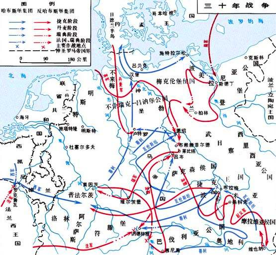 1618~1648年,由神圣罗马帝国内战发展为欧洲主要国家卷入的大规模国际性战争。 17世纪初,德意志仍处于诸侯割据状态。各邦诸侯因信仰不同和教产矛盾分别组成新教联盟和天主教联盟。为了与对方抗衡,双方均寻求外国势力支持。而已形成统一集权国家的英、法、西班牙等欧洲大国正在谋求对外扩张,遂把地处欧洲中心、具有重要战略位置但又四分五裂、日趋衰落的德意志作为角逐目标。战前,欧洲各国形成两大对立集团:哈布斯堡集团由奥地利、西班牙、德意志天主教联盟组成,得到罗马教皇和波兰的支持;反哈布斯堡集团由法国、丹麦、瑞典、荷兰、德意志新教联盟组成,得到英国、俄国的支持。战争导火线是波希米亚(捷克)爆发民族起义,反对神圣罗马帝国皇帝任命天主教徒斐迪南为捷克国王。战争分四个阶段,主战场在德意志。 捷克阶段(1618~1624) 斐迪南任国王后,禁止新教徒的宗教活动,拆毁其教堂。1618年5月23日,布拉格爆发起义。起义者冲进王宫,把皇帝的两名使者从窗口抛入壕沟,并成立由30人组成的临时政府,宣布捷克独立。次年6月,起义军包围维也纳,但在神圣罗马帝国和西班牙军队侵入捷克后撤退。8月,捷克议会选举新教联盟首领、普法尔茨选侯弗里德里希为捷王。1620年9月,天主教联盟军2.4万人在J.T.蒂利伯爵率领下侵入捷克,于11月8日在布拉格附近的白山击败新教联盟军和捷克起义军(约2万人),布拉格陷落。捷克再度沦为哈布斯堡王朝领地,起义惨遭镇压。年底,西班牙出兵普法尔茨。1621~1623年,蒂利回师击败普法尔茨新教诸侯军队。 丹麦阶段(1625~1629) 1625年2月.丹麦在英、荷、法支持下,以援助德意志新教联盟为名出兵德意志,占领卢特城。与此同时,曼斯菲尔德率英军进占捷克西部。神圣罗马帝国皇帝起用A.W.E.von瓦伦斯坦为武装部队总司令。1626年4月,瓦伦斯坦在德绍击败英军。8月,蒂利军收复卢特城。随后,两军协同直捣日德兰半岛(1627),进而攻占梅克伦堡、波美拉尼亚(1628),迫使丹麦签订《吕贝克和约》(1629),保证不再干涉德意志事务。 瑞典阶段(1630~1635) 神圣罗马帝国皇帝和天主教联盟势力向波罗的海发展,引起瑞典不满。在法国支持下, 瑞典国王古斯塔夫二世·阿道夫于1630年7月率兵在奥得河口登陆。此时,天主教阵营发生内部矛盾,瓦伦斯坦被免职,瑞军迅速侵入德意志中部。1631年9月17日,瑞典-萨克森联军在布赖滕费尔德之战中重创蒂利军。瑞典军向西推进到莱茵河畔,萨克森军攻陷布拉格。1632年春,瑞典军回师巴伐利亚,在莱希河之战中击毙蒂利。4月,皇帝再次起用瓦伦斯坦。瓦伦斯坦重组军队收复布拉格(5月),出师巴伐利亚(9月),迫使瑞典军撤向萨克森。11月16日在吕岑之战中,瓦伦斯坦战败,损失惨重,古斯塔夫二世战死。1634年,皇帝在西班牙军队支持下,在讷德林根大败瑞典军。瑞典军被迫北撤。1635年5月,同瑞典结盟的萨克森和勃兰登堡与皇帝缔结《布拉格和约》。 法国─瑞典阶段(1635~1648) 瑞典军战败,促使法国直接出兵。法军在德意志、尼德兰和意大利同时采取行动,留在德意志北部的瑞典军队乘机再次侵入德意志中部和南部。法军在意大利重创西班牙军队,切断西班牙与尼德兰的陆上联系;在尼德兰与荷军协同作战,夺取阿图瓦等地。在德意志,法瑞联军占领阿尔萨斯等地,瑞军重新控制梅克伦堡。1643年5月19日,孔代亲王率领法军2.3万人,在法国北部边境的罗克鲁瓦同F.M.de梅洛将军指挥的西班牙军2.7万人遭遇。法军迂回敌后,攻击对方骑兵并以炮火轰击敌步兵,歼敌1.5万余人。1645年3月,瑞军在捷克南部的扬科夫重创神圣罗马帝国军队。8月,法军在讷德林根打败神圣罗马帝国军队。1648年5月,法瑞联军在楚斯马斯豪森交战中获得巨大胜利。神圣罗马帝国皇帝无力再战,被迫求和。同年10月,参战各方签订《威斯特伐利亚和约》,战争结束。 此次战争是欧洲历史上第一次大规模国际战争,以反哈布斯堡集团的胜利告终。根据和约,欧洲领土被重新分割。法国夺得欧洲霸权;瑞典巩固了在波罗的海的地位;德意志的经济遭到严重破坏,内部分裂局面加剧;