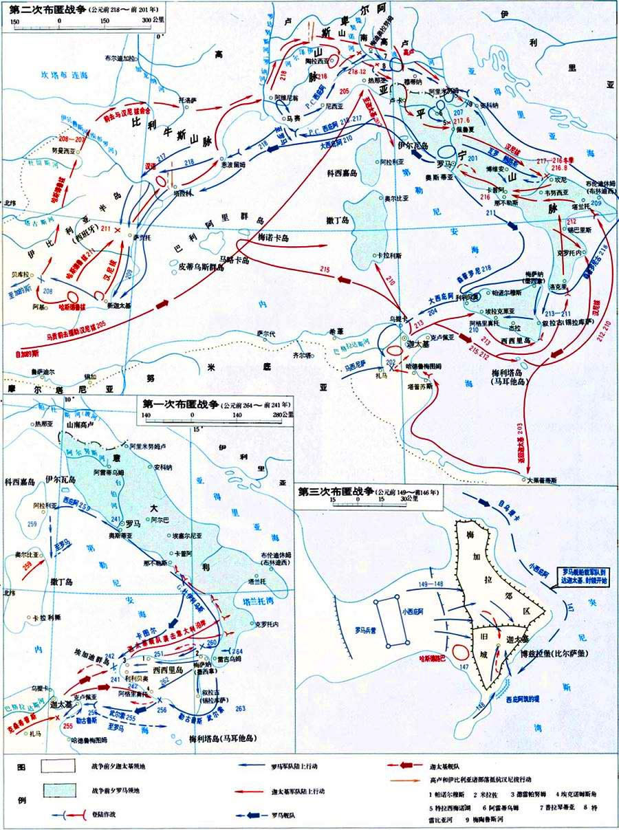 公元前264~前146年古罗马与迦太基争夺地中海西部统治权的战争。因罗马人称迦太基人为“布匿”,故名。前275年罗马征服整个意大利半岛后,成为奴隶制强国,开始向海外扩张,与早已称霸地中海西部的迦太基发生冲突。双方间的战争主要有三次。 第一次战争(前264~前241) 主战场在西西里岛及其附近海域,导火线是梅萨纳争端。原受雇于叙拉古的意大利坎帕尼亚雇佣军,占领西西里岛东北端的梅萨纳(今墨西拿)。前265年,叙拉古僭主派兵围攻梅萨纳。雇佣军处境危急,决定向外求援,但一部分人要求迦太基保护,另一部分人则求助于罗马。正在梅萨纳海峡巡逻的迦太基海军捷足先登,入城赶走叙拉古军队。罗马人担心迦太基从此控制整个西西里乃至西地中海,决定出兵干涉。前264年,罗马军队渡过梅萨纳海峡,击退迦太基军,占领梅萨纳。迦太基向罗马宣战,战争爆发。 战争初期,罗马军在陆战中取得优势,占领西西里岛大部地区,并于前262年攻占迦太基人在西西里岛西南岸的主要据点阿格里真托。但迦太基在海上占有优势,仍控制着西西里岛西部地区和沿海一些要塞。罗马迅速建立一支拥有120余艘大型战舰的舰队,并为在海战中发挥其步兵善于格斗的特长,发明了新的海战技术--接舷吊桥(又称“乌鸦吊”)。前260年在米拉海战中,罗马海军首次使用接舷吊桥,将迦太基舰队打败。前256年,罗马派出一支庞大军队(约5万人、330艘战舰)远征迦太基本土,在埃克诺姆斯角海战中再败迦太基舰队。罗马军队在北非登陆后进展顺利,但随着战事的拖延,兵力和粮食补给日渐困难,士兵思乡厌战,被迫撤回部分兵力。迦太基乘机募集大量雇佣军,并任命有经验的斯巴达人克桑希普斯为统帅,于前255年发动反攻。罗马军大部被歼,执政官勒古鲁斯被俘。前往支援的罗马舰队在返国途中遇风暴袭击,几乎全军覆没。此后,战争在西西里周围又延续10余年。其间,罗马重建舰队。前241年,罗马舰队在西西里岛以西埃加迪群岛附近重创迦太基舰队,击沉50艘,俘70艘,夺得制海权。迦太基无力再战,被迫接受媾和条件:放弃西西里及其与意大利之间各岛屿,10年内向罗马赔偿3200塔兰特。 第二次战争(前218~前201) 罗马虽夺取了西西里,但并未完全掌握对西地中海的控制权,遂继续推行扩张政策。前238年,罗马背弃和约,攻占迦太基属地撒丁岛和科西嘉岛。迦太基也不甘失败,在镇压雇佣兵起义和奴隶暴动后积极备战,准备向罗马复仇。前237年,迦太基将军哈米尔卡·巴卡率军渡海侵入西班牙东南沿海地区,经九年征战和经营使之成为扩军备战、发展经济的基地。前221年,哈米尔卡之子汉尼拔继任军事统帅后加紧战备,于前219年出兵攻占伊贝鲁斯河以南与罗马结盟的西班牙城市萨贡托。次年春,罗马向迦太基宣战。罗马人计划兵分两路,一路由执政官T.森普罗尼乌斯率领,经西西里进攻迦太基本土;另一路由P.C.西庇阿(大西庇阿之父)率领,在高卢登陆牵制汉尼拔。据此,汉尼拔决定先发制人,从陆路进军,以避开罗马的海上优势。前218年4月,汉尼拔率步骑精兵约6万人、战象数十头,从新迦太基城出发,进军意大利。行军途中,迦太基军克服重重天险,粉碎土著部落袭击,翻越阿尔卑斯山,于同年10月抵达意大利北部波河平原,但兵力已损失过半。汉尼拔与被罗马征服的山南高卢结盟,部队兵员及时得到补充。汉尼拔的突然出现使罗马人大为震惊,被迫在本土仓促应战。在提契诺河和特雷比亚河地区,汉尼拔连挫罗马军。罗马军退守中部意大利,分东、西两路堵截,阻止汉尼拔南下。前217年4月,汉尼拔采用迂回战术,穿越难以通过的沼泽地带,绕开敌军主力向罗马挺进。6月,罗马执政官G.弗拉米尼乌斯率兵尾追至特拉西梅诺湖附近山口。时值大雾,弗拉米尼乌斯未经侦察即率4个军团约2.5万人进入三面环山、一面临湖的谷地,遭伏击后几乎全军覆没。弗拉米尼乌斯战死,约1.5万人阵亡,数千人被俘。 |