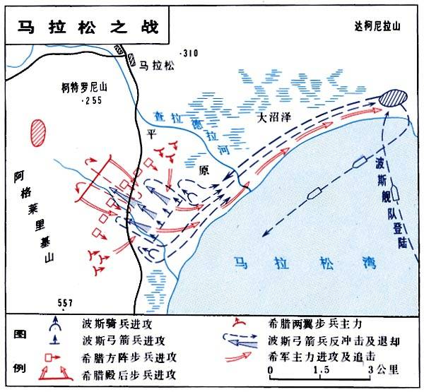希波战争中, 雅典军队与波斯军队在马拉松平原进行的一次会战。公元前490年9月,达提斯和阿塔非尼斯率波斯军约2万余人在雅典城东北约40公里的马拉松平原登陆。雅典全城紧急动员,组成约1万人的重装步兵部队,加上布拉底援军1000人赶赴马拉松。雅典军队在米太亚得指挥下占据有利地形,针对波斯军惯用的中央突破战术布成方阵,正面宽约1公里,主力配置于两翼。12日晨,会战开始。雅典军乘波斯军骑兵主力尚未赶到之机,率先发起进攻。波斯军实施反击。雅典中军且战且退,诱使波斯军拉长战线,两翼随即发起攻击,形成夹击之势,重创波斯军,随后乘胜追击。波斯军溃败,乘船撤退。此战,雅典军抓住有利战机,战术巧妙,以少胜多,歼敌6400人,缴获战船7艘,损失仅192人。雅典军首战大捷,增强了希腊人团结抗战的必胜信心。