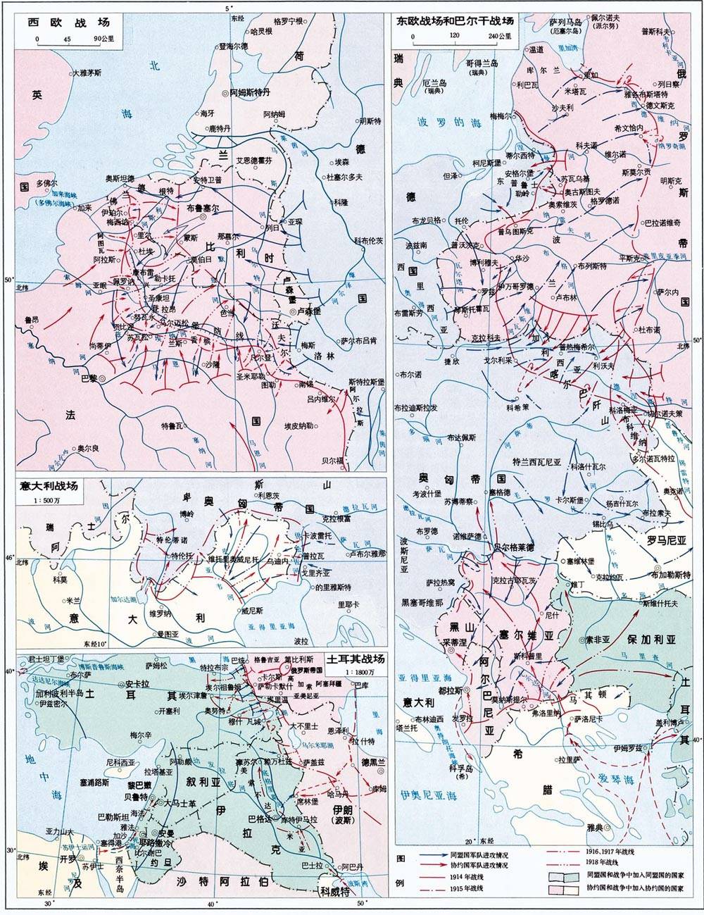1918年,双方在意大利战场增加兵力:奥军展开60个师(火炮7500门、飞机580架),意军增加到56个师(火炮9600余门、飞机676架)。6月,奥军为配合德军在西线的进攻,在特伦蒂诺和皮亚韦河同时发动进攻,在若干地段楔入意军防线,但因受山地条件限制和缺乏预备队而未能及时扩张战果;意军适时投入预备队实施反击,迫使奥军撤至进攻出发地。10~11月,意军以8个集团军的兵力发起总攻,在维托里奥威尼托战役中突破奥军防线。奥军士气低落,消极厌战,全线崩溃。意军俘敌38.7万人,缴获火炮2300门。11月3日,奥、意签署停战协定。 土耳其战场战况 为保持本国领土完整和收复被俄国占领的土地,土耳其在德国怂恿下于1914年10月底派舰队协同德舰袭击俄国军舰及其黑海沿岸港口。10月30日,俄对土宣战。11月初,俄土双方开始在陆上采取军事行动,分别攻入对方领土。11月5、6日,英法分别对土宣战。11月12日,土对英、法、俄宣战。英国企图夺取波斯湾和美索不达米亚的石油资源,控制苏伊士运河,确保其殖民地印度和埃及的安全,同时建立与俄国的直接联系。德国则期望土耳其切断俄国与其盟国的海上联系,牵制协约国军队的部分兵力。土军总兵力78万人,编成40个步兵师、40个骑兵团,另有57个预备师、24个非正规骑兵团,最高统帅为穆罕默德五世,由陆军大臣恩维尔帕夏指挥。土军统帅部计划在高加索和埃及两个方向上分别对俄、英作战。战斗在高加索、美索不达米亚、加利波利半岛和巴勒斯坦-叙利亚四个地区进行。 在高加索战线,1914年11月~1916年9月,俄高加索集团军先后与土第3、第2集团军激战,重要战役有凯普里凯战役、萨勒卡默什战役、哈马丹战役和埃尔祖鲁姆战役。俄军击退土军进攻,占领西亚美尼亚和波斯北部部分地区,并协同英军粉碎土德军队对波斯和中亚的武装渗透。 在美索不达米亚地区,英军3个旅于1914年11~12月在波斯湾登陆,占领巴士拉并建立前进基地。次年11月,英军1个军沿幼发拉底河和底格里斯河向巴格达方向实施突击。12月,其突击集团1万人在库特伊马拉被土军第6集团军包围,被迫于1916年4月向土军投降。1917年2~3月,英军得到加强后继续进攻,在俄军配合下攻占巴格达。1918年10月,英军发起总攻,击败土第6集团军,夺取摩苏尔油田。 在加利波利半岛,英法联军自1915年2月起发动达达尼尔海峡战役,登陆加利波利,企图夺取达达尼尔和博斯普鲁斯两海峡,占领伊斯坦布尔,迫使土耳其投降,但遭土军顽强抗击,伤亡14.6万人,被迫于1916年1月撤退。