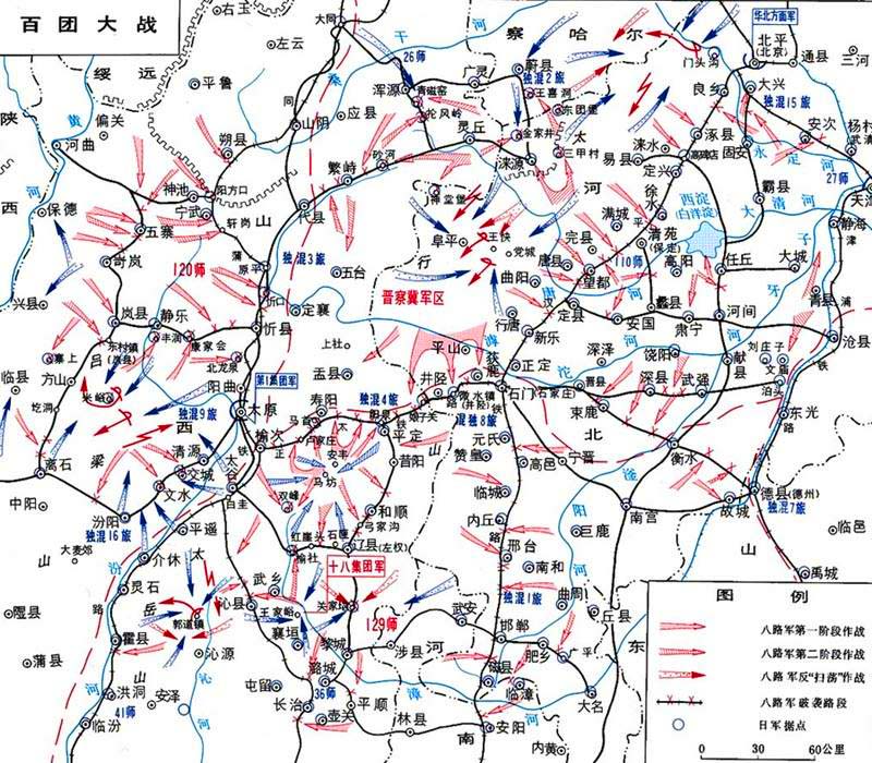 抗日战争时期,八路军在华北地区使用105个团的兵力,向日军占领的交通线和据点发动的大规模进攻战役。 1940年夏秋,日本帝国主义乘德国法西斯军队在西欧和北欧迅猛推进、美国的战备尚未完成、英国又无力东顾之机,积极准备实行“南进”政策,攫取英、美、法、荷等国在东南亚和西南太平洋上的殖民地。因而,在中国战场加紧对国民党政府进行政治诱降活动,同时以主要力量继续进攻抗日根据地,特别是在华北加紧推行1940年度“肃正建设计划”和以“铁路为柱,公路为链,碉堡为锁”的“囚笼政策”,企图摧毁华北各抗日根据地,巩固其占领区,使中国成为其“南进”的后方基地。 为粉碎日本侵略者的“囚笼政策”,争取华北战局更有利的发展,并影响全国的抗战局势,克服国民党妥协投降的危险,八路军总部决心向华北日军占领的交通线和据点,发动大规模进攻战役。 7月22日,八路军总司令朱德、副总司令彭德怀等下达《战役预备命令》,规定以不少于22个团的兵力,大举破击正太铁路(今石家庄—太原)。同时要求对同蒲(大同—风陵渡)、平汉(今北京—汉口)、津浦(天津—浦口)、北宁(今北京—沈阳)、德石(德州—石家庄)等铁路以及华北一些主要公路线,也部署适当兵力展开广泛的破击,以配合正太铁路的破击战。8月8日,朱德、彭德怀等下达《战役行动命令》,规定:晋察冀军区破击正太铁路石家庄(含)至阳泉(不含)段;第129师破击正太铁路阳泉(含)至榆次(含)段;第120师破击忻县以北的同蒲铁路和汾(阳)离(石)公路,并以重兵置于阳曲南北地区,阻击日军向正太铁路增援。要求各部在破击交通线的同时,相机收复日军占领的一些据点。在这些地区和交通线,驻有日军3个师的全部、2个师的各2个团、5个独立混成旅全部、4个独立混成旅的各2个营、1个骑兵旅的2个营,共20余万人,另有飞机150架和伪军约15万人。八路军参战兵力,计晋察冀军区39个团、第129师(含决死队第1、第3纵队等)46个团、第120师(含决死第2、第4纵队等)20个团,共105个团20余万人,还有许多地方游击队和民兵参加作战。 以正太铁路为重点,进行交通总破击战 八路军的进攻战役于8月20日首先在正太铁路发起。正太铁路横越太行山,是连接平汉、同蒲两铁路的纽带,是日军在华北的重要战略运输线之一。日军在正太铁路沿线驻有独立混成第4旅(司令部驻阳泉)全部,独立混成第8、第9旅(司令部分别驻石家庄和太原)各一部。8月20日夜,晋察冀军区在司令员兼政治委员聂荣臻指挥下,以18个步兵团、1个骑兵团又2个骑兵营、5个游击支队,在部分炮兵和工兵配合下,组成左、中、右3个纵队,分别向正太铁路东段日军独立混成第8旅大部和独立混成第4旅一部展开攻击。经数小时激战,右纵队攻入晋冀交界的要隘娘子关,歼日军一部。尔后,破坏了娘子关以东的桥梁和通信线路。向娘子关至微水段进攻的中央纵队,连克蔡庄、地都、北峪、南峪等日军据点,并破坏桥梁两座。攻击井陉煤矿的中央纵队一部,在矿工支援下,破坏了煤矿的主要设施,迫使其停产达半年之久。23日,因石家庄方向的日军西援,加上连日降雨,河水泛滥,严重妨碍作战行动,晋察冀军区部队遂转移兵力,实施对铁路、桥梁、隧道的全面破击。 第129师在师长刘伯承、政治委员邓小平指挥下,以8个团(包括决死队第1纵队2个团)、8个独立营的兵力,组成左翼破击队、右翼破击队和中央纵队,亦于8月20日夜对正太铁路西段日军独立混成第4旅大部和独立混成第9旅一部展开攻击;另以2个团会同平定、辽县、榆社等地方武装,分别对平辽、榆辽公路进行破击,并牵制各点守敌,保障主力侧后的安全。左翼队一部进攻芦家庄,连克碉堡4座,歼日军80余人;右翼队一部攻击桑掌和铁炉沟等据点,歼日军130余人。21日,该师为阻止日军从侧背攻击破路部队,令预备队一部抢占阳泉西南4公里处的狮垴山高地。从23日起,阳泉日军在飞机支援下,并使用化学武器,不断向狮垴山猛攻。第129师阻击部队英勇奋战,坚守6昼夜,歼日军400余人,保障了破击部队翼侧的安全。经数日作战,第129师控制了正太铁路西段除阳泉、寿阳以外的大部分据点及火车站,严重破坏了该段的路轨、桥梁、隧道,使正太铁路西段陷于瘫痪。 与此同时,第120师在师长贺龙、政治委员关向应指挥下,以20个团的兵力破击同蒲铁路北段和铁路以西一些主要公路,并攻占阳方口、康家会、丰润村等据点,歼日伪军800余人,切断了同蒲铁路北段和忻县至静乐、汾阳至离石等公路。 为配合正太铁路和同蒲铁路北段的破击战,第129师和晋察冀军区还令所属部队出动50多个团的兵力,在游击队和民兵的配合下,对平汉、平绥(今北京—包头)、北宁、同蒲(南段)、白晋(白圭—晋城)、津浦、德石等铁路线和一些主要公路,以及日军占领的许多据点,进行了广泛的破击和袭击。 8月25日后,日军从白晋铁路、同蒲铁路南段抽调第36、第37、第41师各一部,配合独立混成第4、第9旅向第129师反击;从冀中、冀南抽调约5000人的兵力,配合独立混成第8旅向晋察冀军区部队反击。9月2日,日军合击正太铁路南侧的安丰、马坊地区的第129师。该师以4个团的兵力英勇抗击,毙伤日军200余人。9月6日,第129师第386旅和决死队第1纵队各两个团,于榆社西北双峰地区包围日军1个营,击毙400余人,打破了日军的合击。晋察冀军区为策应第129师作战,以4个团向正太铁路北侧盂