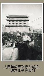 辽沈战役后,盘踞在唐山、天津、北平、张家口等地的国民党军华北“剿匪”总司令部总司令傅作义所部50余万人受到巨大威胁,已成“惊弓之鸟”,或撤或守,举棋不定。为稳住傅作义集团,中共中央军委采取了一系列措施,包括命令华北军区(1948年5月,由晋察冀和晋冀鲁豫两军区合并组成)第1兵团缓攻太原;华东、中原两野战军缓歼杜聿明集团等。最重要的是命令东北野战军主力提前结束休整,隐蔽入关,尽早截断傅作义集团向海上的逃路;命令华北军区第3兵团及东北野战军先遣兵团包围张家口,截断平绥铁路,阻止平津地区傅作义集团主力西撤。 1948年11月29日,东北野战军和华北军区部队主力联合发起平津战役。至12月20日,在平张铁路线上的华北军区第2、第3兵团和东北野战军先遣兵团将傅作义集团第11兵团和第35军包围于张家口和新保安两地,并歼灭了由怀来、南口西援的第104军和第16军主力;在北平周围及天津、塘沽地区的东北野战军主力,完成了对塘沽、天津和北平的分割包围,圆满地实现了中央军委关于抑留傅作义集团于平津张地区并实行“围而不打”、“隔而不围”的战略布局。从12月21日开始,逐批围歼被分割包围之敌。华北军区第2兵团攻克新保安,歼灭第35军;华北军区第3兵团及东北野战军第4纵队歼灭由张家口向北突围的第11兵团部及7个师。1949年1月14~15日,东北野战军以5个纵队攻克天津,歼守军13万余人。在此期间,中共中央为加强东北、华北两军的统一指挥及统筹管理平、津、唐及其附近区域一切工作,决定以林彪、罗荣桓和华北军区司令员聂荣臻组成总前委,林彪为书记。 天津解放后,北平守军已深陷重围之中。经过谈判,傅作义接受了人民解放军的条件,命令所属部队25万人开出城外,听候改编。31日,人民解放军进驻北平城,北平和平解放。平津战役历时64天,人民解放军共歼灭和改编国民党军52万余人,解放了除绥远省西部、山西省太原和河南省新乡、安阳等少数孤立据点以外的华北广大地区。 另外,西北野战军于1948年8~11月先后进行了澄郃、荔北战役和冬季攻势,歼灭国民党西安“绥靖”公署主任胡宗南所部6万余人。华北军区第1兵团于10月5日发起太原战役,肃清了太原外围守军,包围了太原城,于12月上旬奉命转入围城休整。 1948年7月~1949年1月,人民解放军在同国民党军进行战略决战中,共歼灭国民党军200多万人。国民党赖以发动内战的主要精锐集团丧失殆尽,不论在军事上、政治上、经济上都已面临绝境。 |