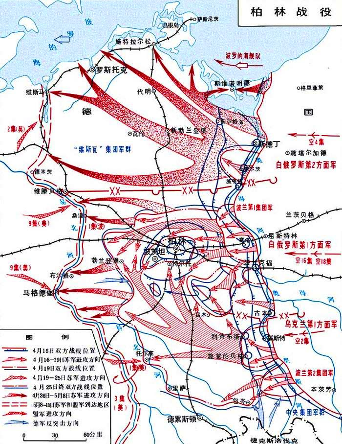 苏德战争末期,苏军为攻占法西斯德国首都并给德军以最后歼灭性打击,于1945年4月16日~5月8日进行的进攻战役。 战前态势 1945年春,苏、美、英等盟国军队分别从东西两面进入德国本土作战。苏军进抵奥得河、尼斯河一线,距柏林仅60公里;盟军先头部队也前出到易北河附近,距柏林100~120公里。东西两线都为最后歼灭法西斯德军进行积极准备。军事上陷于腹背受敌的德国,政治局势面临绝境,人力物力资源完全枯竭,士气低落,败局已定。但A.希特勒困兽犹斗,竭力拖延战争,指望反法西斯同盟内部发生分裂而使战争出现转机。德军统帅部把阻止苏军向柏林进攻作为主要目标,用于防守该方向的是“维斯瓦”集团军群(司令为G.海因里齐大将,4月28日起为K.施图登特大将)和中央集团军群(司令为F.舍尔纳元帅),总计48个步兵师、9个摩托化师、6个装甲师,以及其他许多独立兵团,共约100万人、火炮和迫击炮10400门、坦克和强击火炮1500余辆、作战飞机3300架;此外,还有陆军总预备队8个师,以及柏林市内国民突击队200多个营。德军建立了坚固的纵深梯次防御,包括奥得河—尼斯河防御地区和柏林防御地域。奥得河—尼斯河防御地区由三道防御地带组成,纵深20~40公里,主力配置在第二防御地带。 柏林防御地域由外层、内层、市区三道围廓组成,外层围廓距市中心25~40公里。 苏军最高统帅部为彻底消灭法西斯德军,结束欧洲战争,且鉴于英国首相W.L.S.丘吉尔力促英美军队先于苏军攻占柏林,决心快速实施攻克柏林的战役。参加战役的有:白俄罗斯第1、第2方面军,乌克兰第1方面军,波罗的海舰队一部,空军远程航空兵和国土防空军各一部,第聂伯河区舰队,以及波兰的2个集团军、1个坦克军和1个航空兵军,总计162个步兵师和骑兵师、2个坦克军和机械化军、4个空军集团军,共250万人、火炮4.2万门、