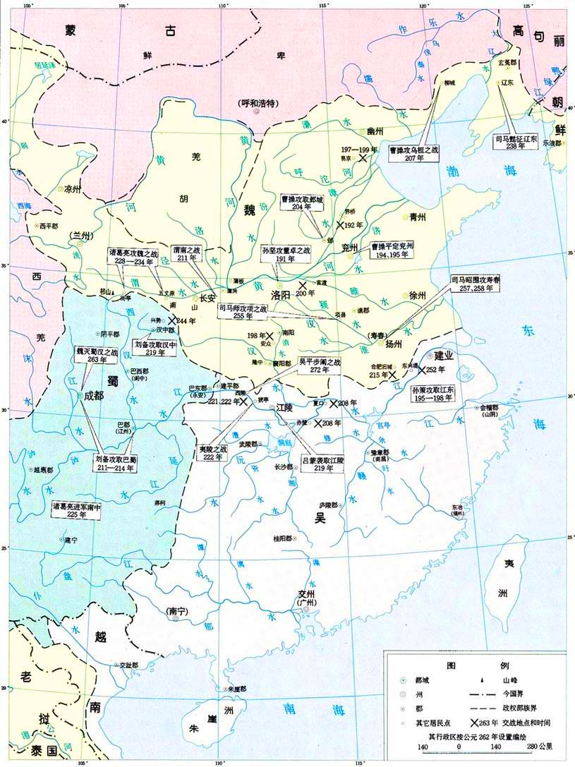中国历史上,魏、蜀(汉)、吴三国形成和鼎立时期(190~280),豪强势力混战兼并,三国争夺天下,最终归于晋的一系列战争。 纷争的缘起 中国自秦始皇建立统一的多民族国家后,经两汉一统局面维持了四百年。东汉后期,政治腐败,横征暴敛,加之灾情严重,民不堪命,农民纷纷奋起反抗。汉灵帝中平元年(184),爆发张角等领导的大规模黄巾起义战争。封建地主阶级的统治受到威胁,汉廷急忙令大将军何进等守卫京城,镇压起义。当时,骑都尉曹操、佐军司马孙坚率军参与屠杀。涿县(今河北涿州)的破落皇裔刘备也趁机组织武装,参加镇压。在镇压起义过程中,豪强地主原有的私家武装部曲由隐蔽转为公开,数量猛增;州郡官吏也纷纷扩充势力,与王朝的关系日益松懈,地主大土地所有制发展导致的分裂形势日趋严重。 王朝为加强对州郡的控制,改行政长官“州刺史”为统掌军政大权的“州牧”,并派有名望的人去充任,结果适得其反,加剧了割据。中平六年汉灵帝死后,掌握朝政的大将军何进为宦官所杀,并州牧董卓率军入洛阳,拥立汉献帝,先后逼走曹操和袁绍、袁术兄弟等,独揽朝政。京城的混乱,董卓的专横,促使割据势力迅速扩大。州郡牧守各树一帜,招兵买马,剧增私兵部曲,纷纷讨伐董卓。混战迭起,形成四分五裂局面,东汉王朝随之名存实亡,历史进入三国形成时期。 三国形成时期战争 这一时期中,曹操挫败群雄,统一中国北方,孙策攻取江东、刘备攻取巴蜀为立国之地,形成三国鼎立格局。 初 平元年(190),关东州郡联军讨伐董卓,以袁绍为盟主,进屯洛阳(今河南洛阳东)周围。董卓迁献帝都长安(今西安西北)后,分兵镇守洛阳外围之函谷、伊阙、广成、大谷、轘辕、旋门、孟津、小平津等八关,以拒联军。十余万联军各怀异心,观望不前。曹操孤军西征,战败而还,遂独立发展武装。接着,附从后将军袁术的长沙太守孙坚,率军攻董卓,于次年将其逼出洛阳(见孙坚攻董卓之战)。其后,孙坚死于袁术与刘表争夺荆州的混战中,董卓亦为中郎将吕布所杀,豪强混战愈演愈烈。袁绍威逼冀州牧韩馥让位后,又于初平三年的界桥之战击败占据幽州的公孙瓒,扭转了被动局面。进而于建安四年(199)发动易京之战,将公孙瓒击灭,拥有冀、青、并州及幽州大部,成为中国北方最强的势力。 曹操于初平三年为兖州牧后,软硬兼施,招降青州黄巾军30余万,选其精锐编为“青州兵”,增强了力量,但表面仍顺从袁绍,协助袁绍北击公孙瓒,南迫袁术败走江淮。因吕布乘虚夺占兖州大部,曹操平定兖州,收复失地,并汲取教训,纳荀彧“深根固本以制天下”(《三国志·荀彧传》)之策,巩固兖、豫州根据地。继而迫汉献帝迁都许(今河南许昌),自任大将军,“挟天子以令不臣”,又广求人才,奖励农业,在许县及交通沿线地区屯田,足食强兵。此后三年,运用分化瓦解、各个击破之策,相继在安众之战中击败张绣,攻徐州擒杀吕布,困死袁术,成为北方惟一能与兵多地广的袁绍抗衡的势力。 同时,孙策亦筹谋攻取江东为立国之地。兴平元年(194),从袁术处领得其父孙坚旧部曲千余人,次年率众五六千,与周瑜合军,挥军东渡,夺取牛渚、秣陵。后攻克会稽(今浙江绍兴),进占东冶(今福州),公开与袁术断绝关系,独自发展。孙策据江东三郡,在北方混战而无力远顾的曹操暂取拉拢之策,表其为讨逆将军,封吴侯。 是时,袁绍欲南攻曹操,曹操亦图谋向黄河以北发展。曹操争取渔阳太守鲜于辅,命其督幽州六郡,以牵制袁绍后方;遣臧霸攻克青州齐、北海等地,以固东翼;分兵至官渡(今河南中牟境,处鸿沟上游,临汴水)设防。接着,争取荆州刘表中立,解除西南部之忧;率军击败刘备,将其赶出徐州,避免了多面受敌。当袁绍于建安五年统军10万进屯黎阳(今浚县境)时,曹操鉴于敌众己寡,先以声东击西战法挫袁军锐气,再回师官渡拒守,相机袭烧袁军粮草,乘势发起攻击,大破袁军,歼其7万余人,赢得官渡之战的巨大胜利。此后,趁袁绍死后其子纷争内战,攻取袁氏基业之地邺城。又远征柳城(今辽宁朝阳南),歼灭逃入乌桓腹心之地的袁氏兄弟及与之勾结的乌桓势力,基本完成统一北方的大业。 建安十三年,曹操作玄武池训练水军,并对可能动乱的关中地区采取措施后,出兵十多万南征荆州(今湖北荆沙),欲一统南北。时孙权承袭其兄孙策之业已八年,巩固了江东,又统军攻克夏口(今武汉境),打开荆州东大门,正相机吞并荆、益州。而依附荆州牧刘表的刘备,也开始改变长期寄人篱下的状况,请得诸葛亮为主要谋士,确定先占荆、益,联合孙权,进图中原的大略,并在樊城大练水陆军。刘表病亡,其子刘琮投降曹操后,刘备领军南撤,被曹军追击于长坂(今当阳境),乃率军两万余驻樊口(今鄂州境),与孙权联军,于赤壁之战大败曹操,自为荆州牧,乘胜夺取武陵、长沙等四郡,并向孙权“借”得南郡,作为壮大发展、进图益州的基地。曹操败还北方,孙吴也得以巩固发展。由此奠定三国鼎立的基础。 建安十六年,刘备乘刘璋恐惧曹操进犯之时,以助守之名率兵数万入益州,此后又召诸葛亮等率军入巴蜀,先取郡县,于十九年顺利入主成都。自此与曹操、孙权形成三个独立的、相对稳定的政治、经济、军事中心,三国鼎立的局面完全告成。 三国鼎立时期战争 三国的鼎立,也是三国间长期的、更复杂纷争的开始。 |