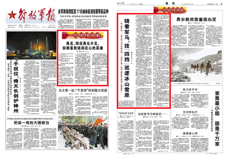 这天,解放军报“新春走军营”专栏在头版显著位置和二版头条,分别刊发中国军网记者李小琳和曹璇分赴西藏、新疆边防一线采写的稿件《再见,抑或再也不见,你都是我铭刻在心的英雄》《骑着军马,挂“四挡”巡逻冰山雪原》,迅速引爆广大网友朋友圈。