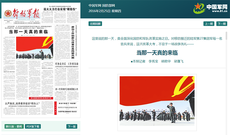 为了这次改版,解放军报社以习主席视察时的重要讲话为遵循,专门成立改版论证小组,分6个方向深入全军部队调研,收集意见建议1300余条,先后15次研讨修订改版方案。读者们惊喜地发现,改版后的解放军报政治上更强、传播上更强、影响力上更强,切实体现出党报和军委机关报的大报风范。