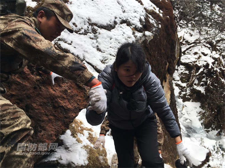 中国军网记者李晨在边防战士的帮助下爬上陡坡。 李国涛 摄