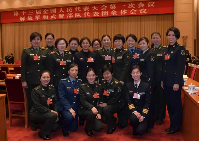 3月7日上午,出席十三届全国人大一次会议的解放军和武警部队代表团举行第一次全体会议。图为与会女代表在会议间隙合影留念。记者冯凯旋 摄