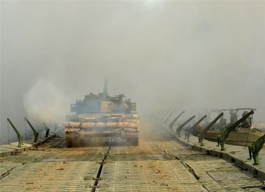 第72集团军某工化旅在长江某支流组织浮桥架设课目演练,坦克在浮桥架设成功后快速通过(4月25日摄)。新华社发(彭希 摄)