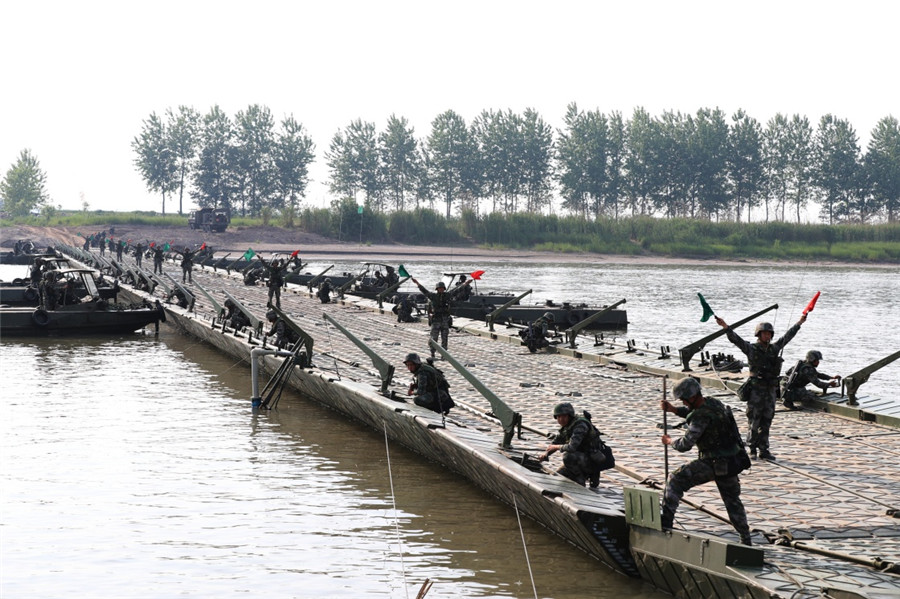 在长江某支流浮桥架设课目演练现场,记者看到,舟桥分队从两岸同步作业,不到40分钟,一条近200米长、承重50吨的钢铁巨龙就横卧江上。在工程破袭队城镇搜排爆等演练中,派出某型察打一体无人机、排爆机器人等智能装备对纵深重要目标侦察、精确破袭、投掷炸药包和爆炸物移除。在夜间展开的工程侦察情报要素演练中,他们利用某信息处理云平台收集分析任务地域情况,为指挥员研判情况提供参考。