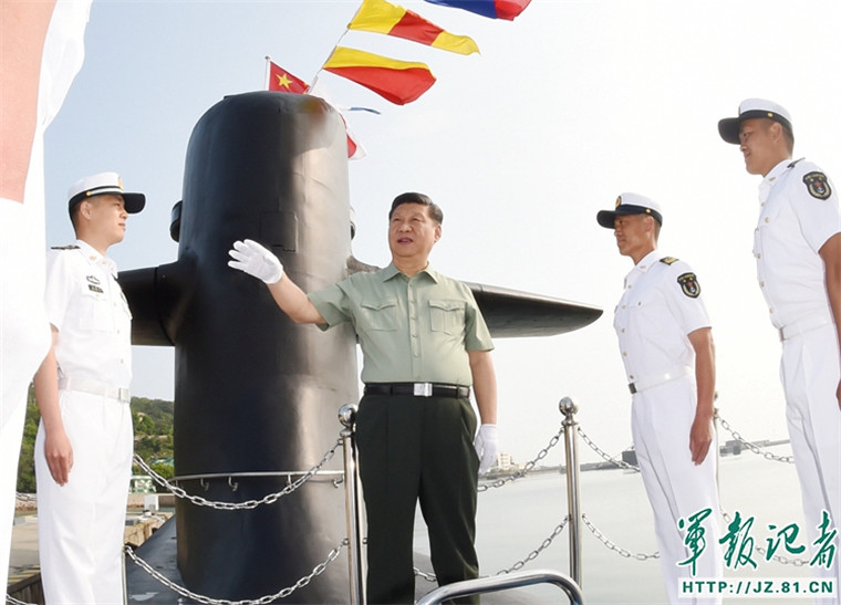夏日的青岛,红瓦绿树,碧海清风。15时30分许,习近平来到某潜艇部队,首先听取了部队建设有关情况介绍。军港码头上,前不久参加过南海海域海上阅兵的某新型潜艇伏波静卧,满旗高悬,艇员们在艇面上分区列队,精神抖擞迎接习近平到来。习近平登上潜艇,走到艇员们中间。习近平一直牵挂着常年奋斗在深海大洋的潜艇兵们,他关切询问官兵的工作生活情况。了解到官兵们爱岗敬业、战风斗浪,圆满完成各项工作时,习近平点头赞许。习近平下舱室、进战位,详细了解武器弹药技战术性能。他勉励官兵们坚定理想信念,建设坚强集体,把打赢本领搞过硬。习近平在潜艇航泊日志上郑重签名。离开码头时,习近平特意走向停泊在附近的另一艘潜艇,向整齐站坡的官兵们挥手致意。