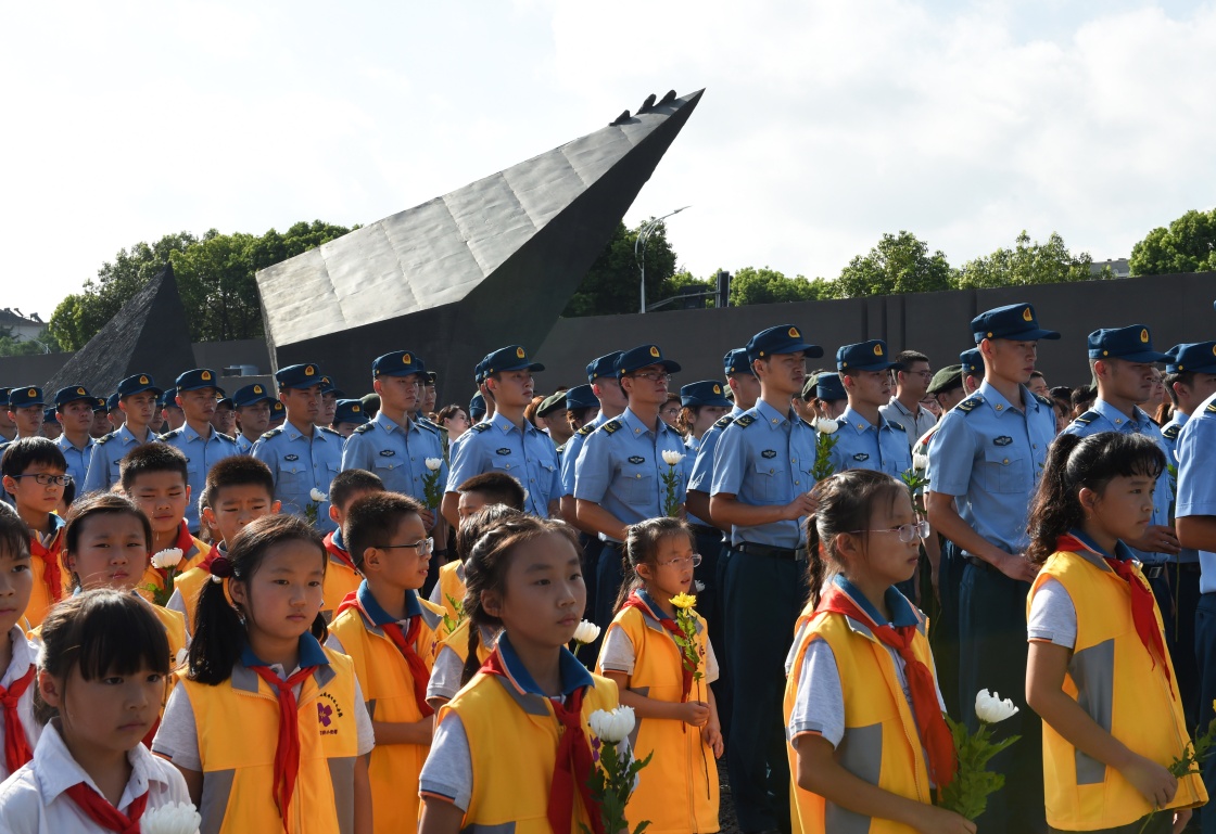 炎炎夏日,风轻云淡。在纪念馆集会广场的灾难之墙前,步履蹒跚的耄耋老人、刚毅笔挺的部队军官、年少可爱的孩子们纷纷献上鲜花、追思逝者。来自安徽宣城的大学生吴全奇从老家赶到南京,清晨就来到了纪念馆。今天是他22岁生日,他说:“在生日这天来纪念馆参加升旗仪式、撞响和平大钟,意义非凡,这是对灵魂的深刻洗涤。作为大学生,我不能忘记历史,还要把它讲给更多人听。”