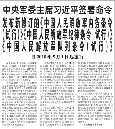 据《解放军报》4月16日报道,中央军委主席习近平签署命令,发布新修订的《中国人民解放军内务条令(试行)》《中国人民解放军纪律条令(试行)》《中国人民解放军队列条令(试行)》(统称共同条令),自2018年5月1日起施行。