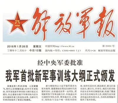 据《解放军报》1月26日报道,经中央军委批准,我军首批新军事训练大纲正式颁发,标志着新体制下军事训练内容体系构建取得重大阶段性成果,为新时代军事训练提供了重要法规遵循。