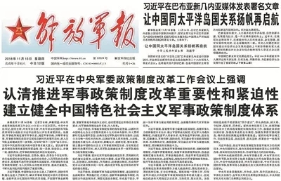 11月13日至14日,中央军委政策制度改革工作会议在京召开。中共中央总书记、国家主席、中央军委主席、中央军委深化国防和军队改革领导小组组长习近平出席会议并发表重要讲话。他强调,要深化我军党的建设制度改革,创新军事力量运用政策制度,重塑军事力量建设政策制度,推进军事管理政策制度改革。