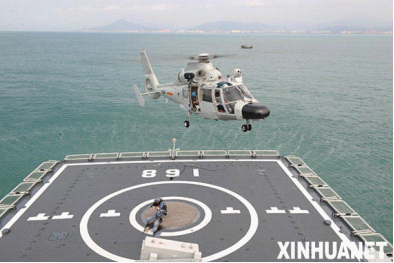 第五批护航编队特战队员在进行直升机滑降训练(2月27日摄)。