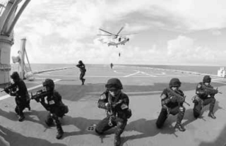 晚上8时,上级下达接护命令,直升机搭载特战队员在苍茫夜色中紧急升空。悬停,滑降。特战队员如神兵天降,准确降落在“德新海”轮前甲板,以最快速度控制了轮船,饱受海盗摧残的27名同胞安全获救。