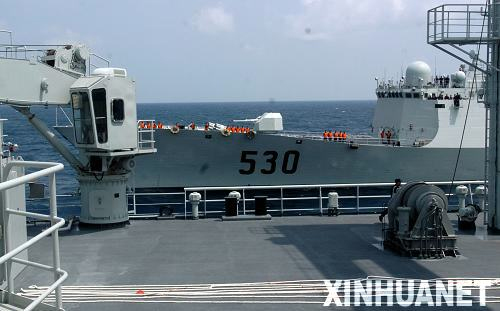 5. 2009年9月18日,中国海军第三批护航编队与俄罗斯海军护航编队共同组织代号为“和平蓝盾—2009” 的海上联合反海盗演练,这是中国海军护航编队首次在任务海域与外军进行联合军演。