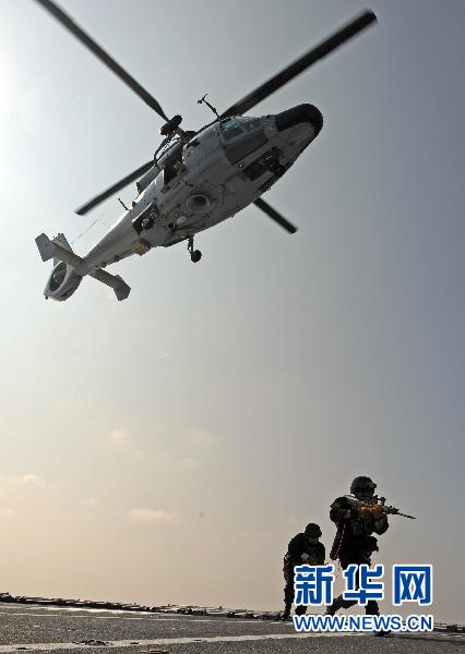 当地时间2010年11月16日凌晨,中国海军第七批护航编队驶入亚丁湾海域,将在与第六批编队任务交接后开始正式执行护航任务。海军第七批护航编队在前往护航海域的航渡期间,制定周密的反海盗针对性训练计划,在艰苦环境中“走一路、练一路”,结合伴随护航、区域护航、随船护卫等要求,完成了舰艇远海机动、舰机协同、拦截打击快速小目标、海上救援等训练科目。这是11月13日,中国海军第七批护航编队特战队员进行直升机滑降训练。?新华社记者范军威摄