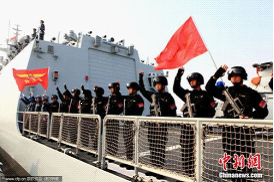 中新社舟山电:由导弹护卫舰“温州”舰、“马鞍山”舰组成的中国海军第八批护航编队,2011年2月21日上午从舟山某军港解缆启航,赴亚丁湾、索马里海域执行护航任务。