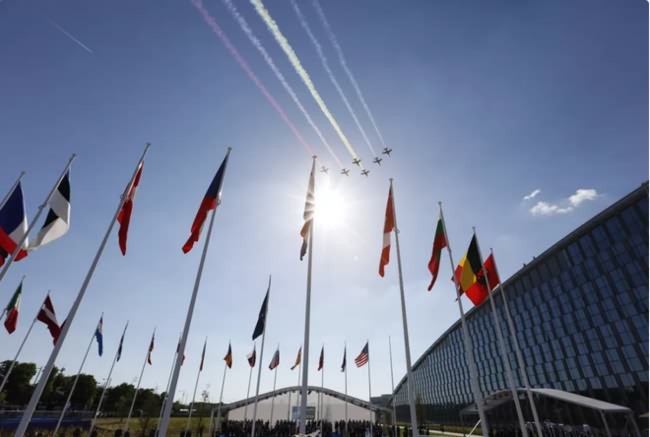 ▲资料图片:在比利时首都布鲁塞尔,飞机从北约新总部大楼上空飞过。(新华社发)