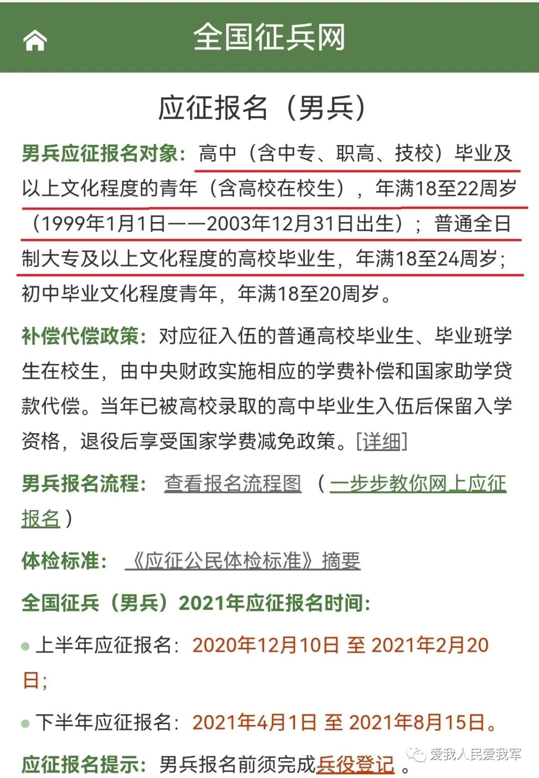 根据全国征兵网最新消息,今年下半年大学生应征报名年龄由往年18-24周岁调整为全日制大学毕业生18-24周岁,非全日制大学生为18-22周岁。这意味着,只有全日制大学毕业生应征报名年龄可放宽至24周岁,而全非日制大学生只能是最大到22周岁。