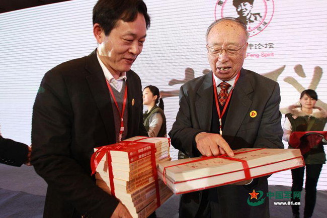 2月28日,雷锋战友原海军副政委冷宽中将代表中华文化促进会向湖南省文明办赠送大型丛书《榜样雷锋》。谭卫兵摄