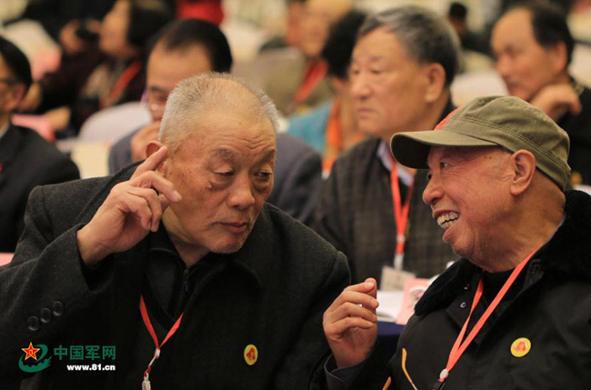 雷锋两位老连长出席活动时相见格外亲切。雷锋的第一任连长李超群(左一),是雷锋的入党介绍人。他提升到营里当参谋长后,副连长虞仁昌(右一)接替他担任了连长。雷锋当年受伤后是虞仁昌把雷锋送到了医院抢救,虞仁昌亲眼目睹了抚顺十万人民告别一位普通的士兵的感人场面。谭卫兵摄